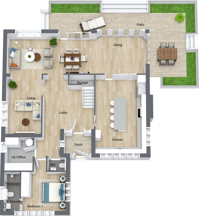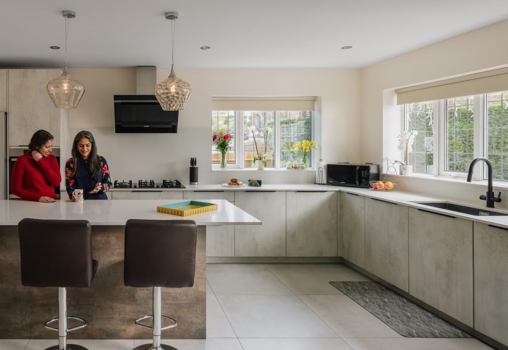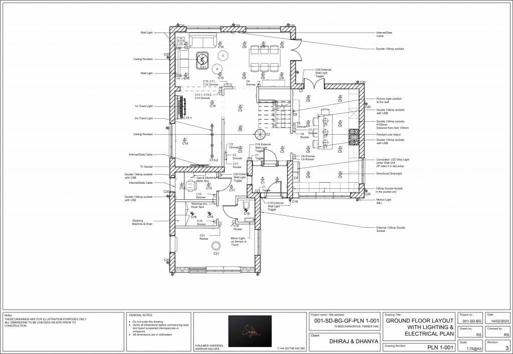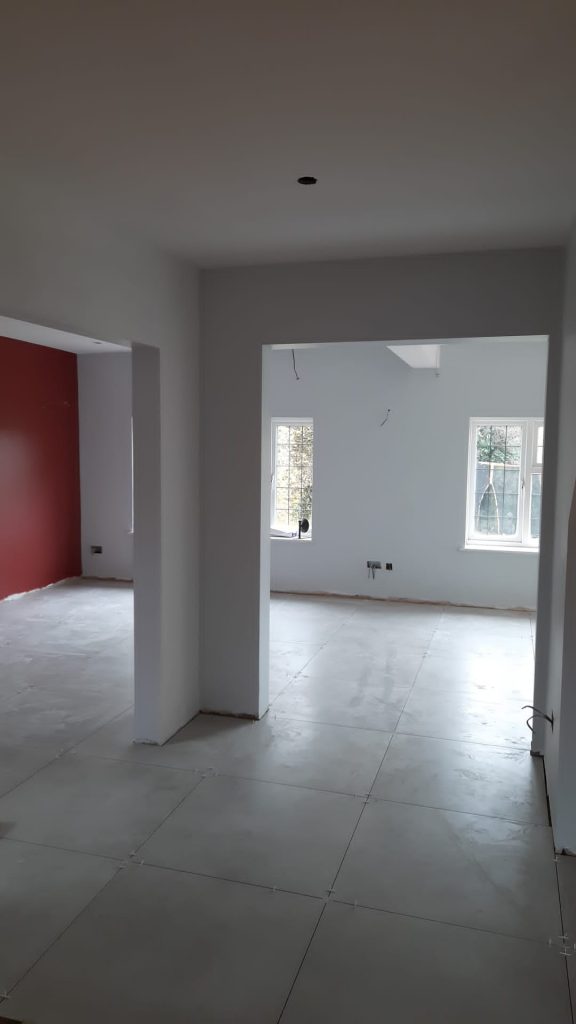 This project began as a colour scheme and lighting plan consultation but gradually expanded to encompass the design and layout of the entire open-plan space on the ground floor. This included decisions on colour schemes, door placements, optimizing gaps in walls for better traffic flow, and selecting tiles and flooring. Although the kitchen had already been chosen by the clients, adjustments were made to the placement of the island for improved efficiency.