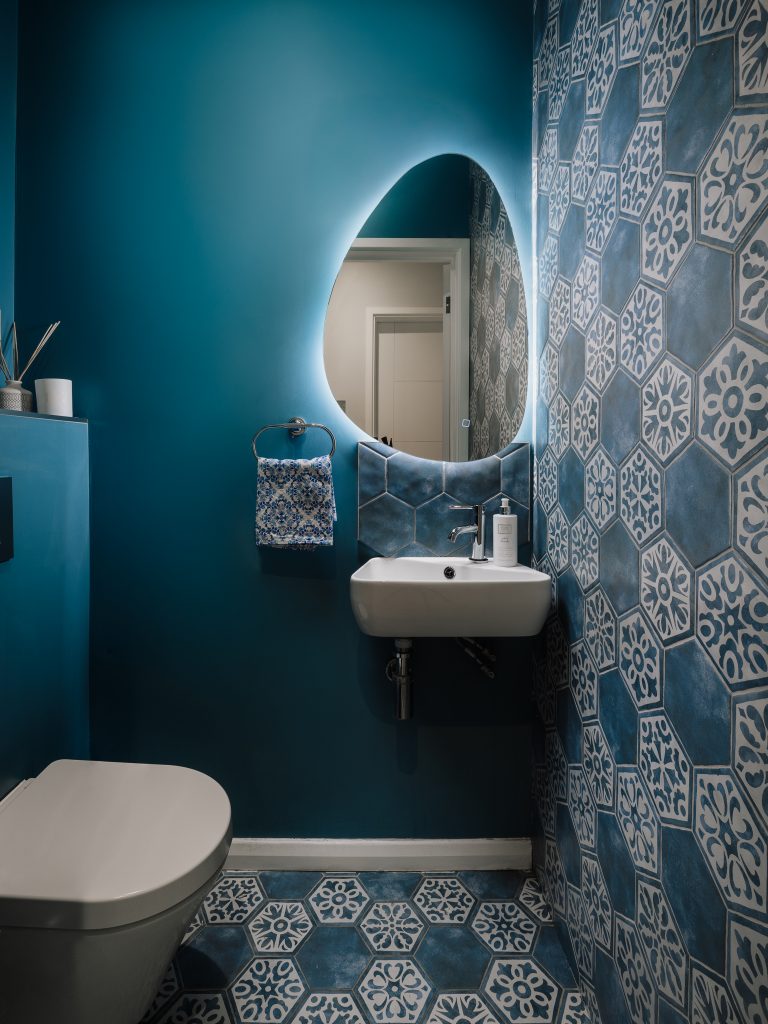 Another notable element was the small guest cloakroom, a tiny space where the clients were struggling with tile choices. After some convincing, hexagon-shaped printed tiles were selected, paired with dark blue walls that drew inspiration from the tile design. This bold choice turned out to be a striking feature of the project, much to the clients’ delight.