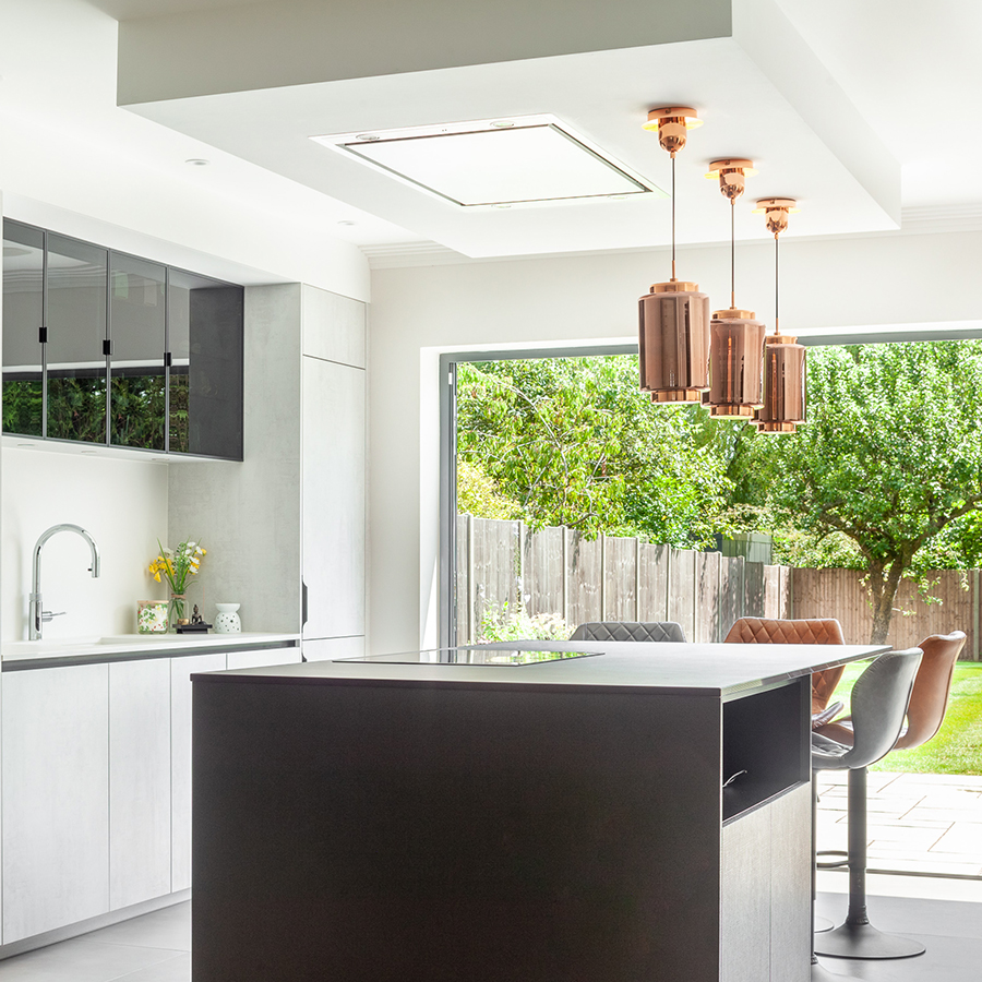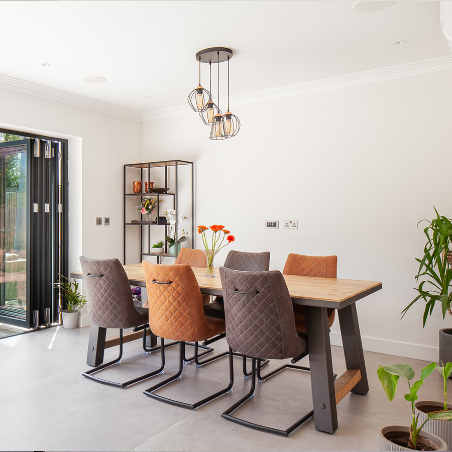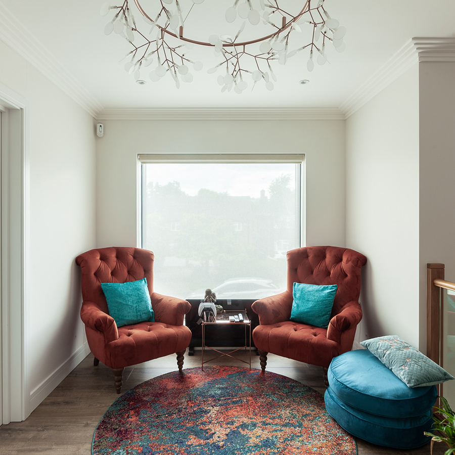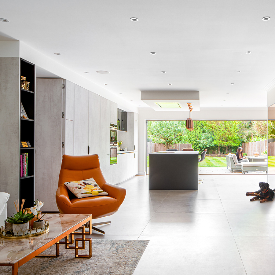 The project featured several intriguing design elements. The client was particularly focused on achieving a sleek, cohesive look in the kitchen, which was accomplished through a series of tall units that included a hidden door leading to the working kitchen and utility area. The lighting plan added another layer of interest, incorporating contemporary fixtures and partial automation. The house was completed just before the Covid lockdown, providing the family with a comfortable and serene haven during that challenging time.