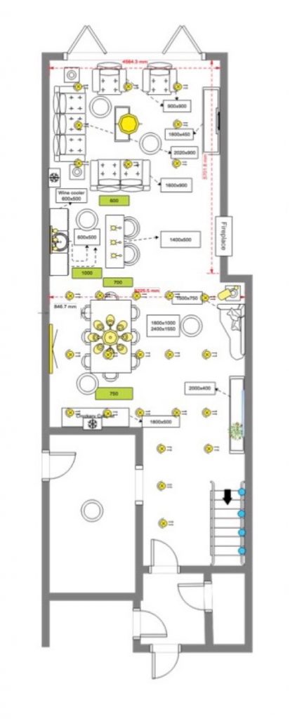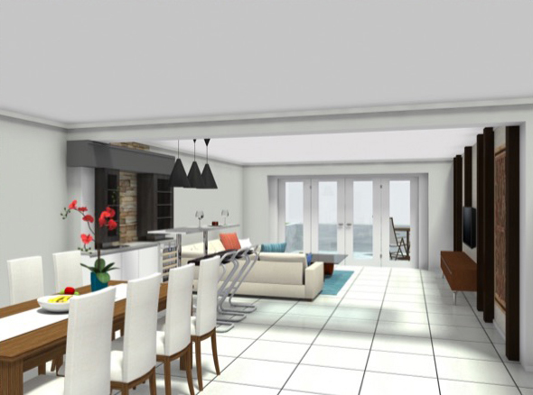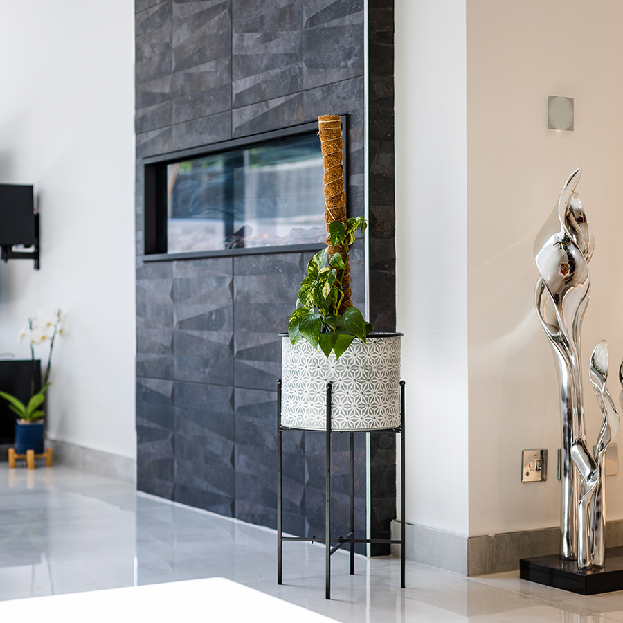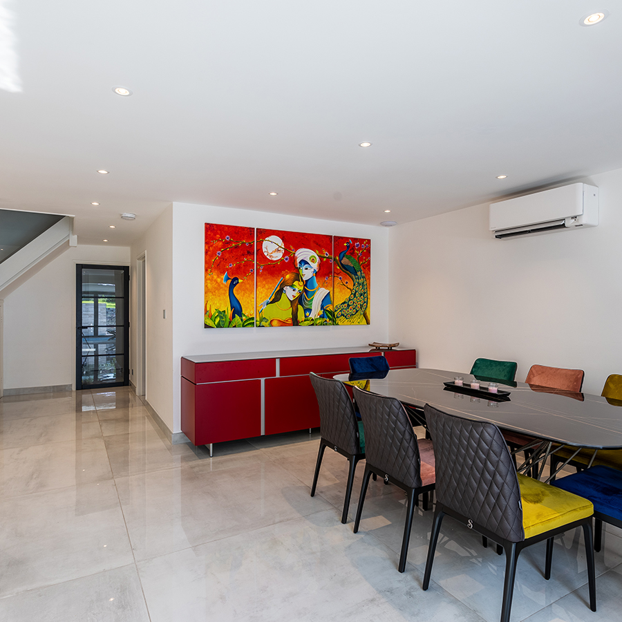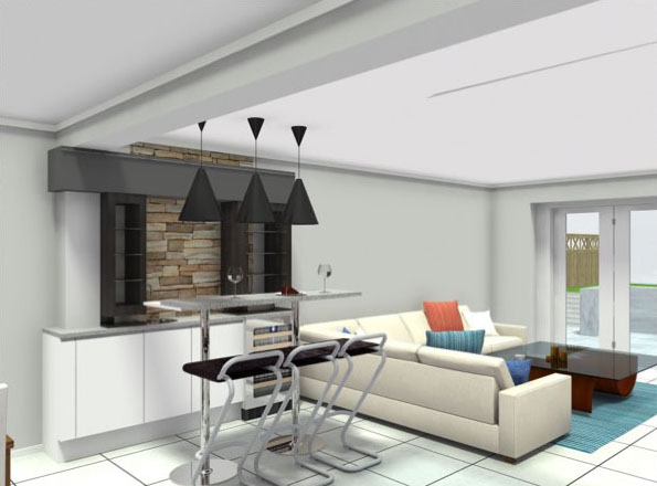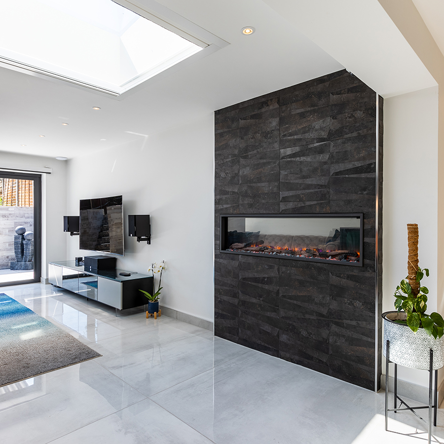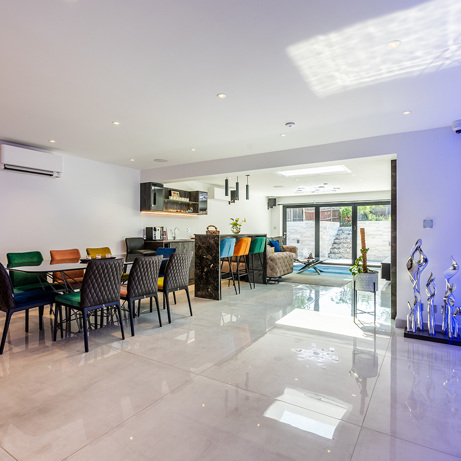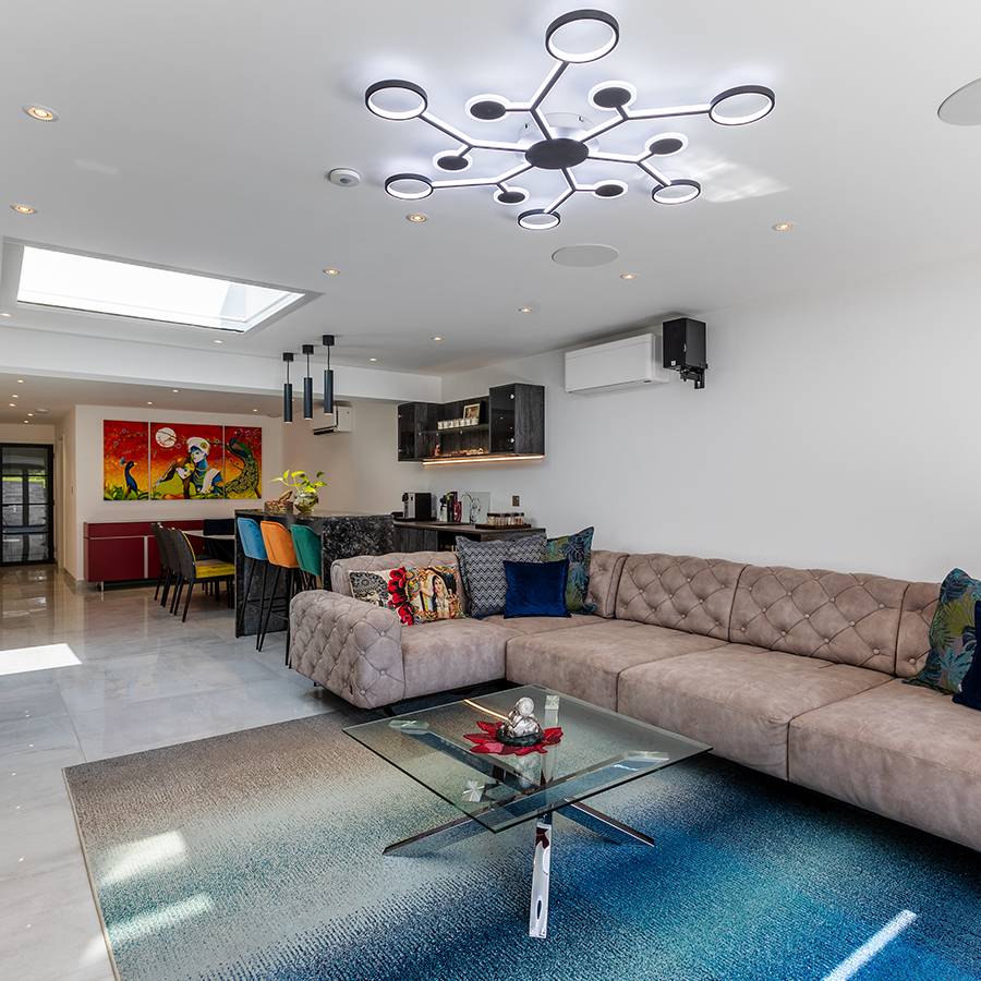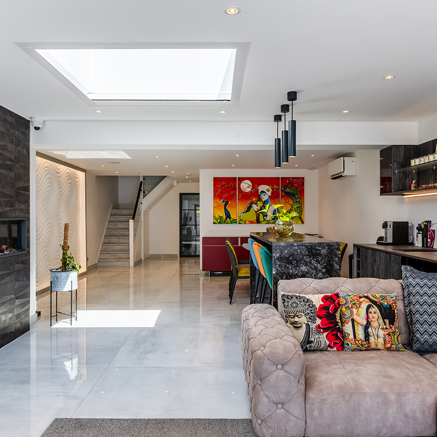 Collaborating with a client with a clear vision results in developing a design that can capture every aspect of the dream for their home. Our client had secured permission to extend the ground floor by six metres which resulted in an expansive ground floor. He also had a clear perspective of what he wanted to accommodate in the extra space and we were able to interpret his needs successfully into the space planning and layout. The space had to include a dining area to accommodate a party of eight, a bar, a fireplace and a snug TV cum living area. The placement of a bright colourful artwork that had been specially commissioned to an artist in India was also a crucial part of the design.